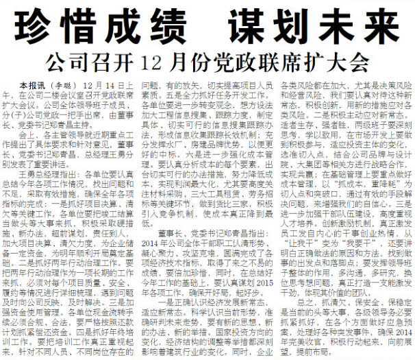 公司 2014年12月份最佳文章评选结果揭晓 来源: 修改时间:2015.01.29 浏览:3765 公司2014年12月份最佳文章评选结果揭晓 根据各单位报送的评选结果并经公司评委会认真研究,2014年12月份《河北二建》和公司官方网站最佳文章是:2014年12月15日《河北二建》一版刊登的《珍惜成绩谋划未来—公司召开12月份党政联席扩大会议》,作者:李聪,单位:公司机关。 上一条 返回列表 下一条