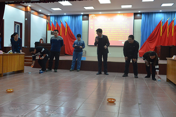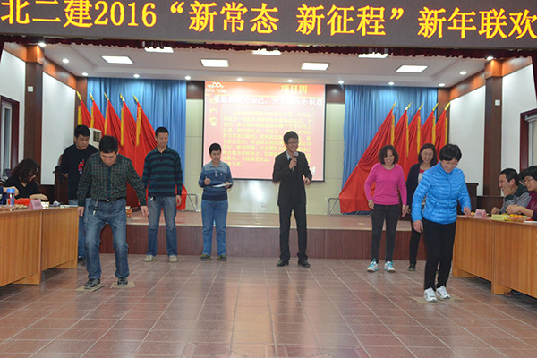 活动伊始,董事长发表了热情洋溢的讲话,并代表公司领导班子向全体职工及家属送上新年的祝福,致以节日的问候。董事长在讲话中充分肯定了公司2015年取得的成绩,他号召公司上下同心同德,携手共创辉煌的2016!同时,主持人宣布新年联欢会开始。十一个部室加之八分公司分成8支队伍,两两进行对决,在“职工团结如一人,试问天下谁能敌”、“春种一粒粟,秋收万颗子”、“莫愁前路无知己,天下谁人不识君”三个游戏中展开激烈的角逐。观众们为比赛双方加油呐喊,使整个活动现场变成了一片欢乐的海洋。